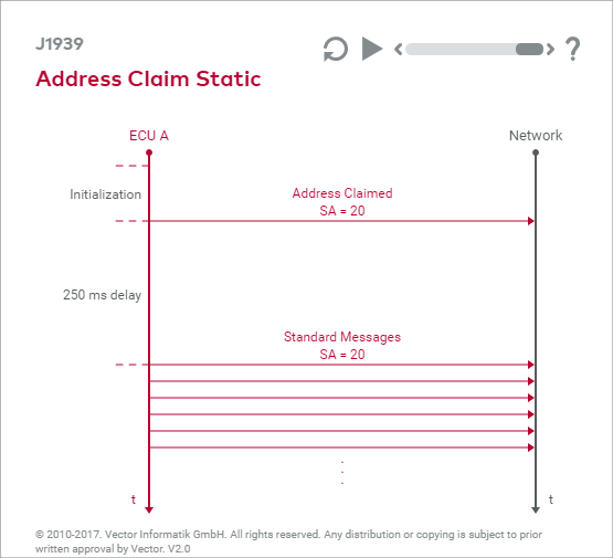 「Address Claim」は、ダイナミックネットワークで使用される。また、ネットワーク管理も発生したすべてのアドレス競合を解決するために使用される。 これらは、例えばECUがネットワークに接続されている時(オペレーションが既に進行中である場合)や、ECUが既にネットワークで使用されている事前定義されたアドレスを使用している時に発生する。 通信において、ネットワーク内のすべてのアドレスがユニークであり、重複してはならないため、競合が起きた場合は解決しなければならない。