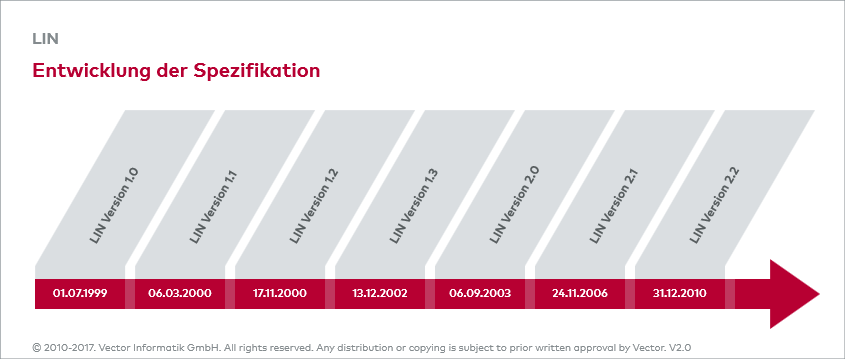 Die erste Spezifikation stammt aus dem Jahr 1999. Im folgenden Jahr stellte das Consortium auf der Konferenz der SAE in Detroit die Version 1.1 vor. Diese bestand aus folgenden Teilen: LIN Protocol Specification, LIN Configuration Language Specification, LIN Application Interface Specification.