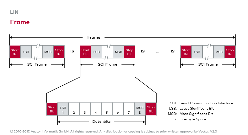 Die serielle Datenübertragung in einem Cluster erfolgt byteorientiert. Jedes Byte wird vom SCI mit dem niederwertigsten Bit (lsb) zuerst übertragen und von einem Start- und einem Stopp-Bit eingerahmt. Diese Kombination aus zehn Bits wird als SCI Frame bezeichnet. Eine Botschaft setzt sich aus mehreren SCI Frames zusammen (siehe Grafik Frame).
