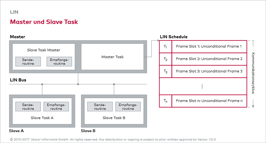 Da es keinen Kommunikationscontroller gibt, wird das Protokoll in Form von Softwarekomponenten auf dem Mikrocontroller implementiert. Hierdurch erhält der jeweilige Knoten eine Master Task bzw. Slave Task, die für die Abwicklung der gewünschten Kommunikation benötigt werden. Generell verfügt jeder Knoten über eine Slave Task, welche zum Empfangen und Versenden von Informationen dient. Der Master besitzt die zusätzliche Master Task, durch die das Senderecht vergeben und der Buszugriff geregelt werden (siehe Grafik Master und Slave Task).