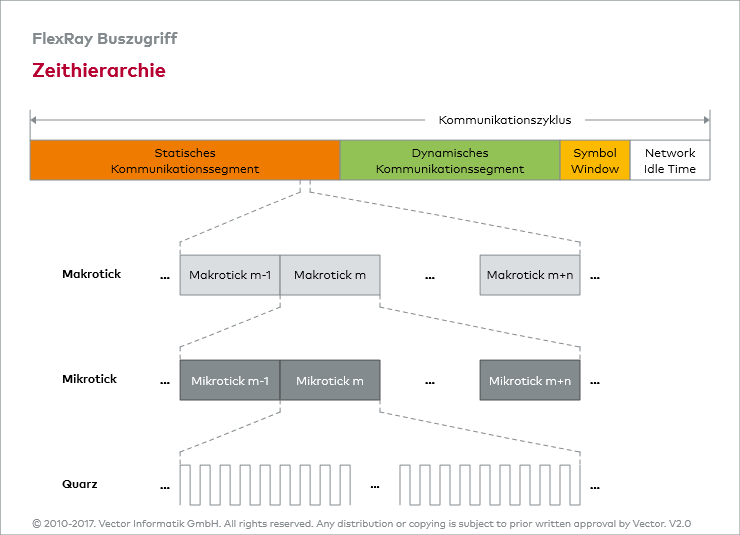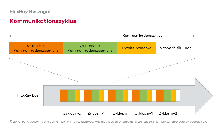 Die Datenkommunikation in einem FlexRay Cluster erfolgt zyklisch auf der Basis eines Zeitplans. Der Kommunikationszyklus setzt sich aus mindestens zwei Zeitsegmenten zusammen, dem statischen Segment und dem Segment Network Idle Time (NIT).