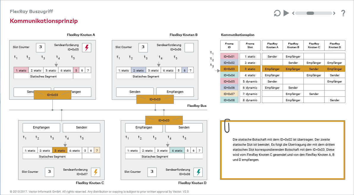 Ihnen stehen sowohl eine interaktive Grafik als auch eine Animation zur Verfügung, um sich mit der Datenkommunikation im FlexRay Cluster vertraut zu machen. Die interaktive Grafik beleuchtet die Kommunikationstechnik im dynamischen Segment. Mit der Animation haben Sie die Möglichkeit, sich mit der Kommunikation sowohl im statischen als auch dynamischen Segment zu beschäftigen. Lesen Sie sich die jeweiligen Anleitungen durch, damit Sie die gesamte Funktionalität der Medienobjekte nutzen können.