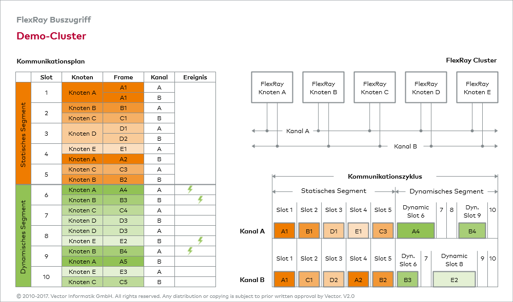 Zur weiteren Veranschaulichung des hybriden Buszugriffsverfahrens und der damit korrespondierenden Datenübertragung wird ein FlexRay Cluster definiert, welcher sich aus fünf FlexRay Knoten zusammensetzt (FlexRay Knoten A bis E). Sämtliche FlexRay Knoten sind, wie aus der Grafik „Demo-Cluster“ hervorgeht, physikalisch mittels einer Linie verbunden. Zur Minimierung des Ausfallrisikos ist der Kommunikationskanal redundant ausgelegt. Zur Datenübertragung stehen somit zwei Kanäle zur Verfügung, Kanal A und Kanal B.