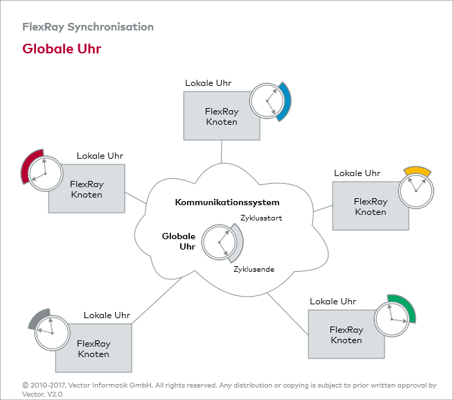 Voraussetzung dafür ist ein globales Zeitverständnis. Weil ein FlexRay Cluster auf einer Multi-Master-Architektur