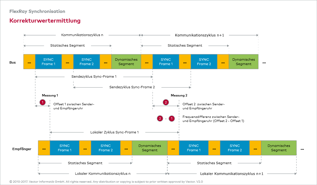Die Synchronisation lokaler Uhren in einem FlexRay Cluster basiert darauf, dass jedem FlexRay Knoten die Sende- und Empfangszeitpunkte aller statischen Botschaften von vornherein bekannt sind. Damit sind alle Knoten eines FlexRay Clusters in der Lage sowohl den Offset als auch die Steigung