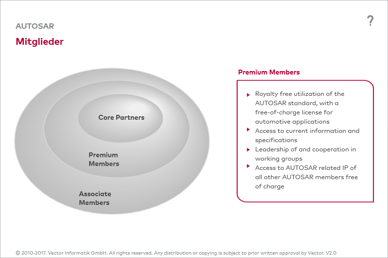 Unter dem Slogan Cooperate on Standards, Compete on Implementation arbeiten die Mitglieder mit unterschiedlichen Rechten und Pflichten in Arbeitsgruppen zusammen. Während die Core Partner entscheiden, wer in das AUTOSAR Konsortium aufgenommen wird, definieren die Premium Mitglieder den Standard.