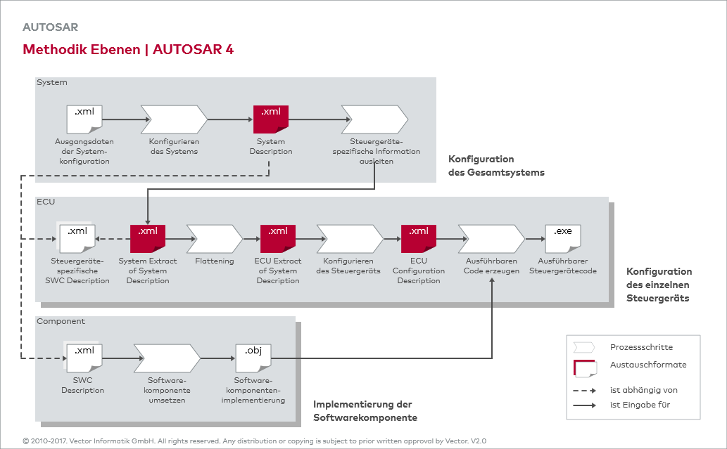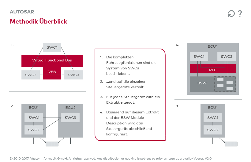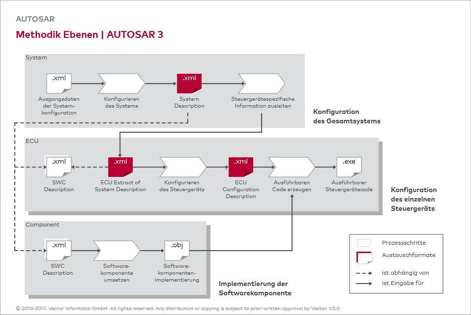 Die Methode zur Entwicklung von Steuergeräte-Software wurde von der AUTOSAR Organisation in der AUTOSAR Methodik definiert. Sie unterteilt den Entwicklungsprozess in Aktionen und standardisiert den Datenaustausch zwischen den Entwicklungspartnern mit einem Satz von XML-Dateien.