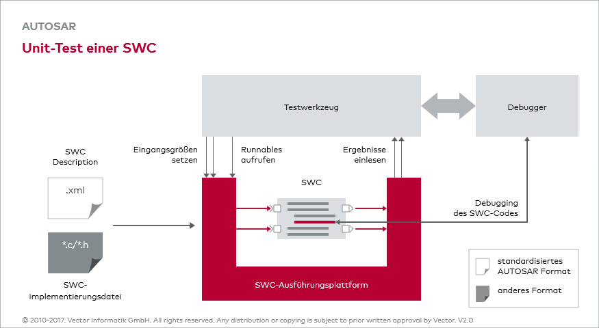 Um eine Wiederverwendung in realen Entwicklungsprozessen zu ermöglichen, ist neben der Schnittstellenkompatibilität auch die Absicherung der SWC-Funktion an sich relevant. Dank der definierten Schnittstellen der SWC lassen sich nun auch Testkonzepte wie ein Unit-Test der SWC durchführen. Damit kann eine SWC unabhängig von anderen SWCs entwickelt werden und als in sich getestete Einheit in einer Bibliothek bereitgestellt werden. Dies kann sogar soweit führen, dass eine SWC als COTS erhältlich ist.
