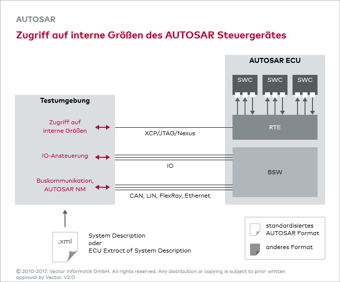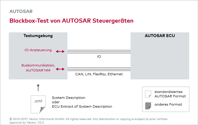 Die Beschreibung der Netzwerk Kommunikation in AUTOSAR ist Bestandteil der System Description. Je nach Vorgabe des OEMs werden die bisherigen Formate wie .dbc, FIBEX oder .ldf durch das neue Format ersetzt. Die Testumgebung muss in der Lage sein, dieses Format zu verarbeiten.