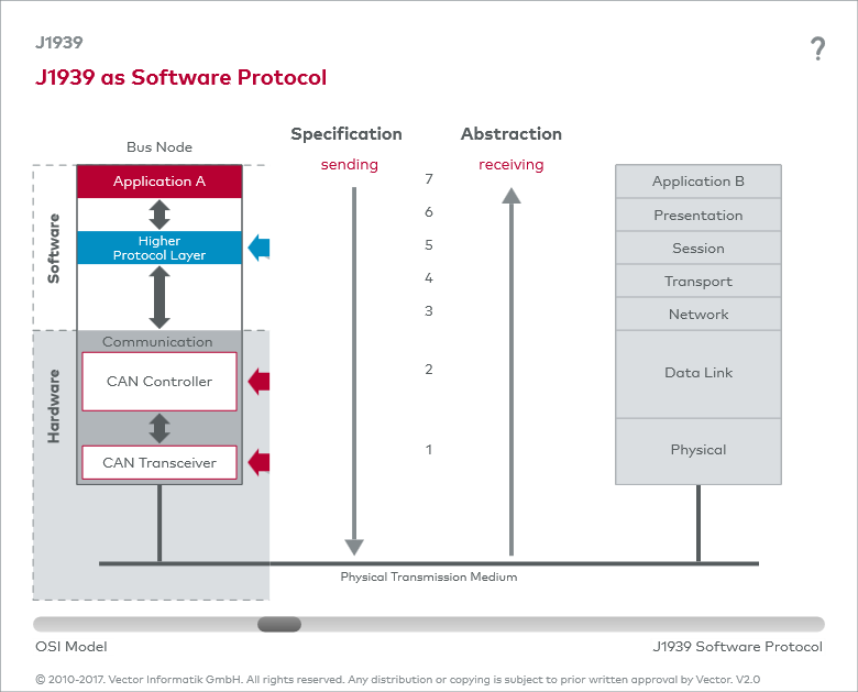 The J1939 protocol is a higher-layer communication protocol. The layers we are talking about must be clarified to start. The ISO has developed a description model that describes the communication of identical as well as different technical systems on seven abstraction layers. The physical layer is the lowest layer and the application itself is the highest layer. The CAN protocol covers the bottom two layers, which are implemented completely as hardware, in the CAN controller and the transceiver.