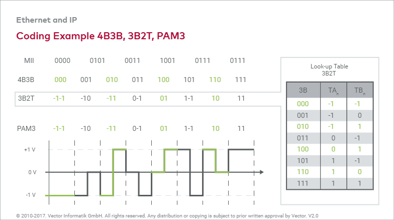 传输对称差分电压的双绞电缆用于物理连接。发送方将需要发送的位流编码成用电压表示的符号。接收方将收到的符号流进行解码从而获取其中包含的位。