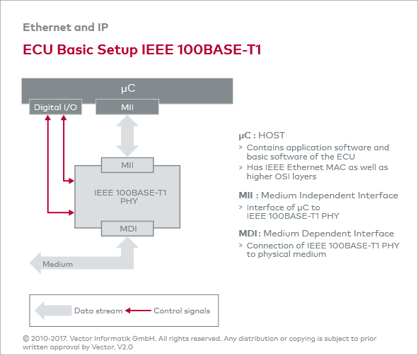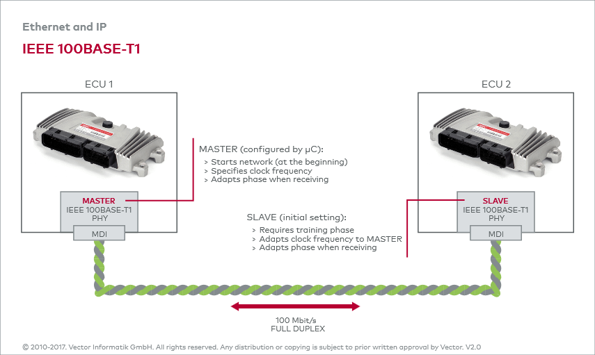 4B3B、3B2T和PAM3方法用于编码和解码以及产生差分电压。这些方法由IEEE 100BASE-T1 PHY实现,集成在ECU的一个特定模块中。PHY在物理介质和以太网控制器之间建立连接。