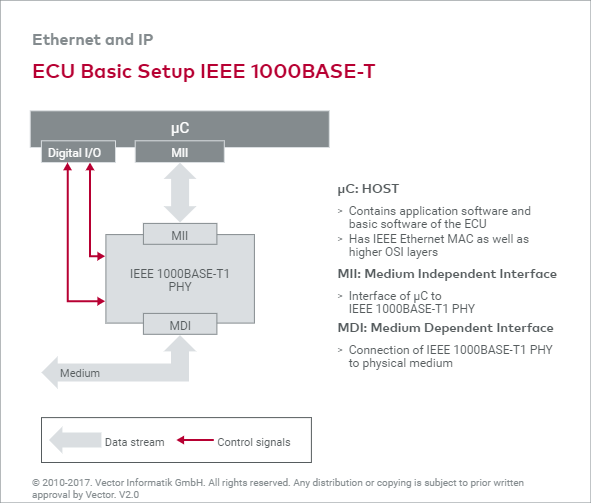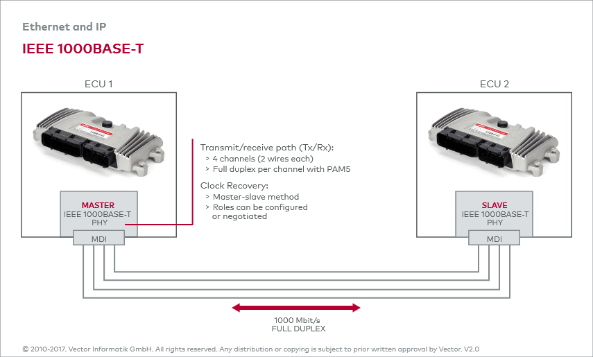 发送方对与位流相对应的符号进行编码。接收方对符号流解码,从而复原发送的位。与IEEE 100BASE-T1和IEEE 100BASE-TX不同,IEEE 1000BASE-T使用8B1Q4、Trellis、Viterbi和PAM5方法进行编码和解码以及生成差分电压。这些方法通过集成在ECU中的IEEE 1000BASE-T PHY模块实现。PHY在物理介质和以太网控制器之间建立连接。