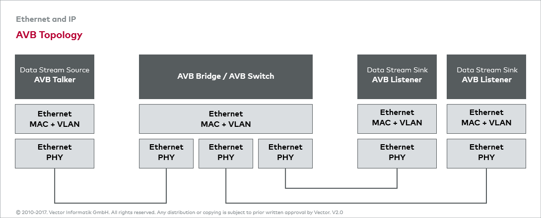2012年,IEEE将“音视频桥工作组”重命名为“时间敏感网络工作组”。现有的协议标准继续扩展,并增加更多的功能。AVB/TSN支持低延迟和高质量的流数据(如摄像头数据)传输。由于数据不会跨网络边界传输,因此至少在汽车中,可以不使用IP、TCP和UDP协议,AVB/TSN协议直接基于以太网。
