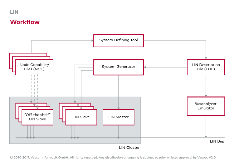 LDF定义了网络的所有属性,通过这些属性可以自动生成用于通信的软件组件。此外,LDF可以为各种分析、测量和测试工具或残余总线仿真器提供必要信息。