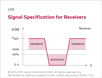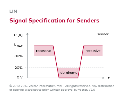 为确保足够的抗噪能力,使用ECU的电源电压和车辆地(参见图片:Drivers)作为总线电平的参考电位。接收方将低于电源电压的40%的电平当做逻辑0,将高于电源电压的60%的电平当做逻辑1(参见图片:Signal Specification for Receivers)。发送方发送低于20%的电压电平作为逻辑0,发送高于80%的电压电平作为逻辑1(参见图片:Signal Specification for Senders)。