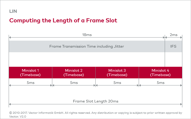 在计算时隙大小时,增加了抖动值。这是时隙的标称起点与实际起点之间的潜在时间差。如果一个帧没有完全填满时隙,在下一个时隙开始前,将会出现一段等待时间,这一时段称为IFS(Inter-Frame Space,帧间间隔)(参见图片:Computing the Length of a Frame Slot)。