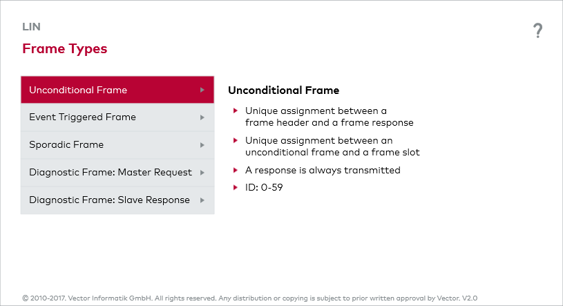 无条件帧由帧头和响应构成。主节点将帧头作为请求发送到总线,然后,特定的从节点以响应方式进行答复。从任务根据ID确定是否需要发送响应。此外,主节点中的从任务也可以响应对应ID的帧头。LDF文件中描述了具体由哪个节点发送相关响应。