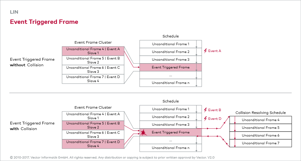 由于可能会有多个节点同时对事件触发帧进行响应,因此可能会发生冲突。主节点使用冲突解决调度表(Collision Resolving Schedule)解决这个问题。这是一种特殊的发送方案,该方案将依次发送对应这一事件触发帧的所有无条件帧的帧头,并按常规的无条件帧处理它们的响应。主节点在检测到冲突后跳转至冲突解决调度表进行一轮发送,然后跳转回最初的调度表。这保证了所有需要发送的响应最终都能被发送出来。