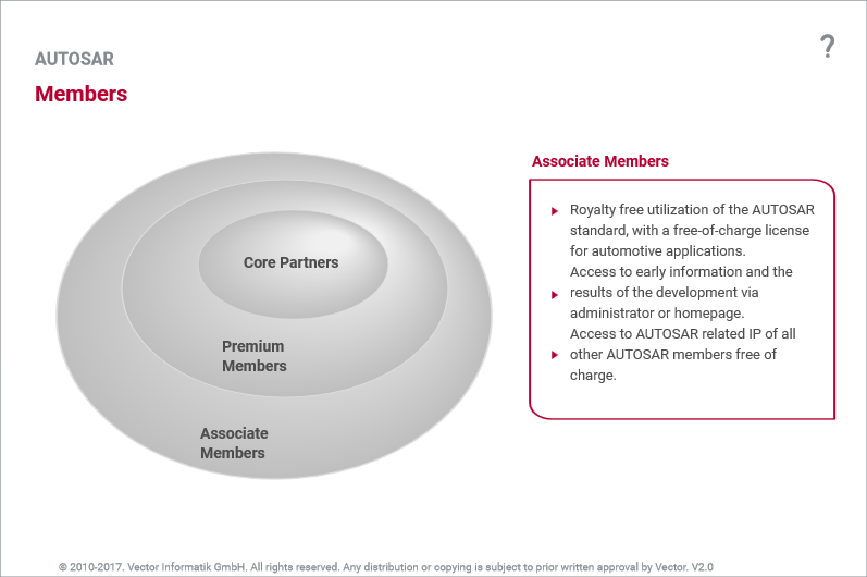 在“标准中合作,实现上竞争”的口号下,各成员以工作组为单位,享有并承担着不同的权利和义务。核心合作伙伴决定哪些团体可加入AUTOSAR联盟,高级成员则负责制定标准。