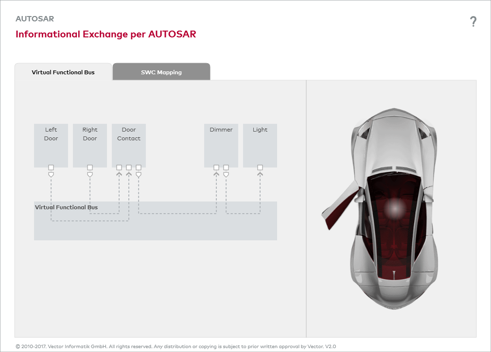 VFB(Virtual Functional Bus,虚拟功能总线)是AUTOSAR中的概念基础,用于SWC之间的通信以及BSW服务的使用。由于SWC通信全部基于VFB,因此SWC独立于ECU硬件。从而可实现在不同项目和平台之间重用SWC。通过为每个ECU配置RTE以及相应的BSW,从而在实际车辆中实现VFB。