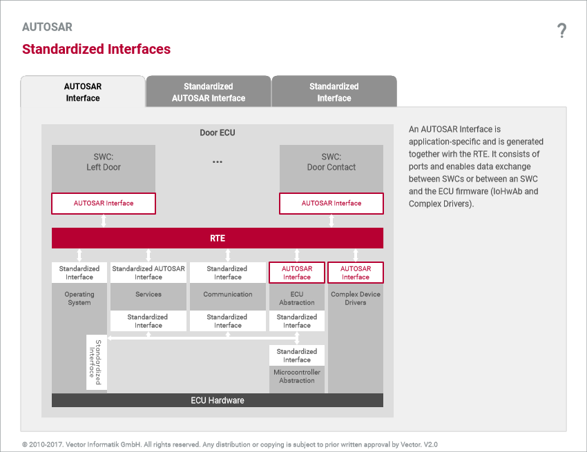 AUTOSAR接口是通用接口,源自任意SWC的端口。AUTOSAR接口由RTE提供,用于SWC之间或SWC与ECU固件(IoHwAb、复杂设备驱动)之间的接口。例如,SWC可以通过这些接口读取输入值并写入输出值。
