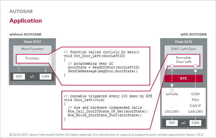从概念上讲,SWC之间的通信由VFB处理。由于开发早期尚未确定将哪个应用软件组件分配给哪个ECU,因此这只是一个逻辑上的观点。VFB表示ECU内部以及ECU之间的通信。应用程序并不了解底层技术,这样可以确保应用程序软件的开发和使用不受硬件影响。