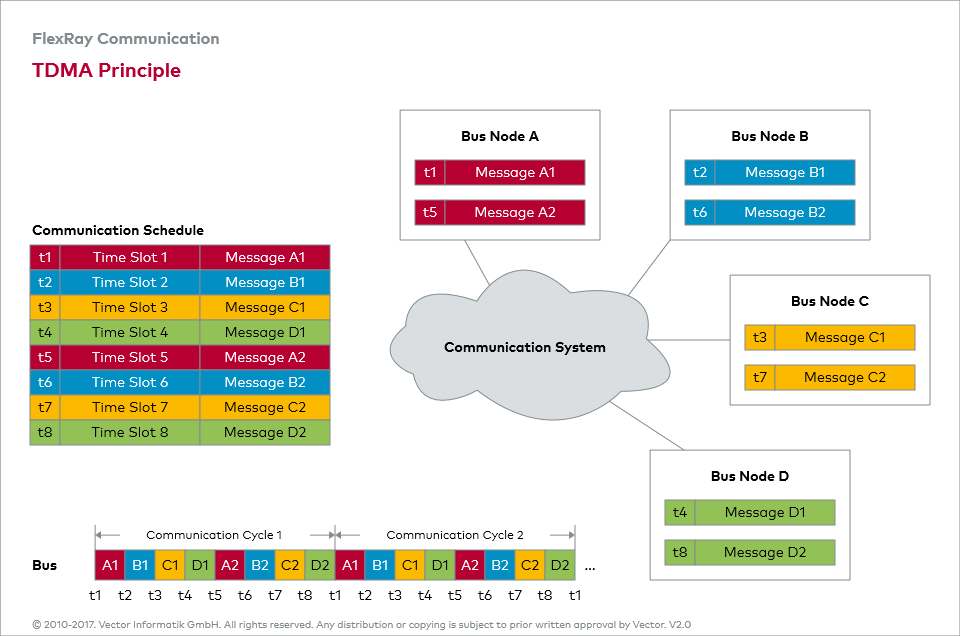 TDMA(Time Division Multiple Access,时分多路访问)用于实现时间触发的控制,这意味着FlexRay节点不像CAN节点那样以不受控制的方式访问总线来响应应用程序相关事件。FlexRay节点必须遵守精确定义的通信调度表,该调度表会在每个通信周期为每个FlexRay报文分配特定的时隙,规定所有FlexRay报文的发送时间。