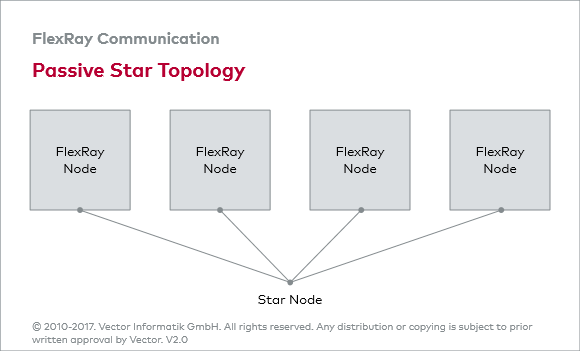 此类拓扑称为被动星型。即使在此类物理拓扑中,任意两个FlexRay节点之间的线长也不得超过24米。此外,根据EPL规范,被动星型中最多连接22个FlexRay节点。