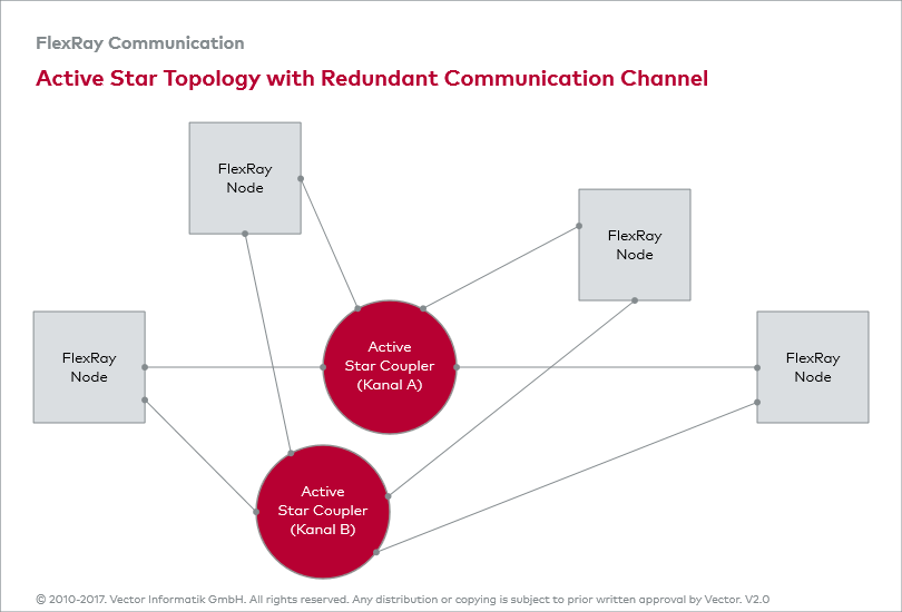 作为被动星型拓扑的补充,FlexRay节点也可以通过主动星型耦合器进行互连:需要互连的FlexRay节点按星型排列,中心的被动星型节点替换为主动星型节点。