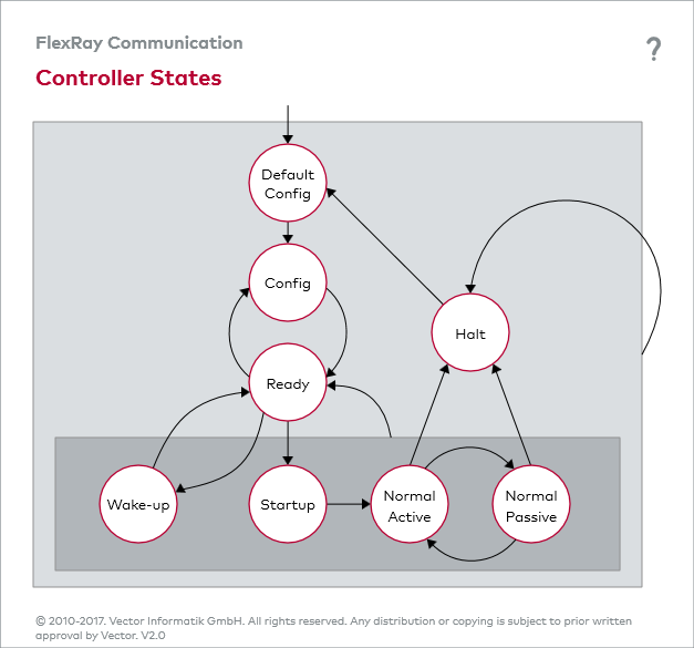 FlexRay控制器可以根据通信进程进入八种不同的状态。每个状态都有相应的通信行为,并由相应的通信组件控制。通信组件POC(Protocol Operation Control,协议运行控制)负责切换控制器状态。