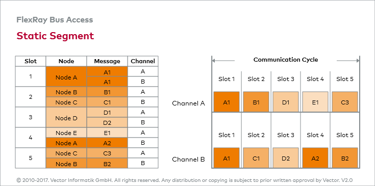 “Static Segment”图中显示了通道A和通道B的通信调度表。两个通道的第一个时隙传输相同的报文,这样单个通道发生故障不会导致报文无法传输。但冗余通信通道也可以用于加快数据传输速率,而不是提高容错能力。这正是静态段的其他时隙所采用的方法:在两个通道中传输不同的报文,而且可以为每个FlexRay报文分别选择容错性或提高数据传输速率。