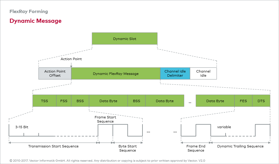 在静态时隙和动态时隙中,十一个隐性位(通道空闲定界符)都表明通信介质可用。由于根据FlexRay规范,动态报文必须精确地以下一个可能的动作点结束,因此报文传输通过所谓的动态尾部序列进行扩展。这确保了每个接收方都可以确定动态报文在哪个微时隙终止。