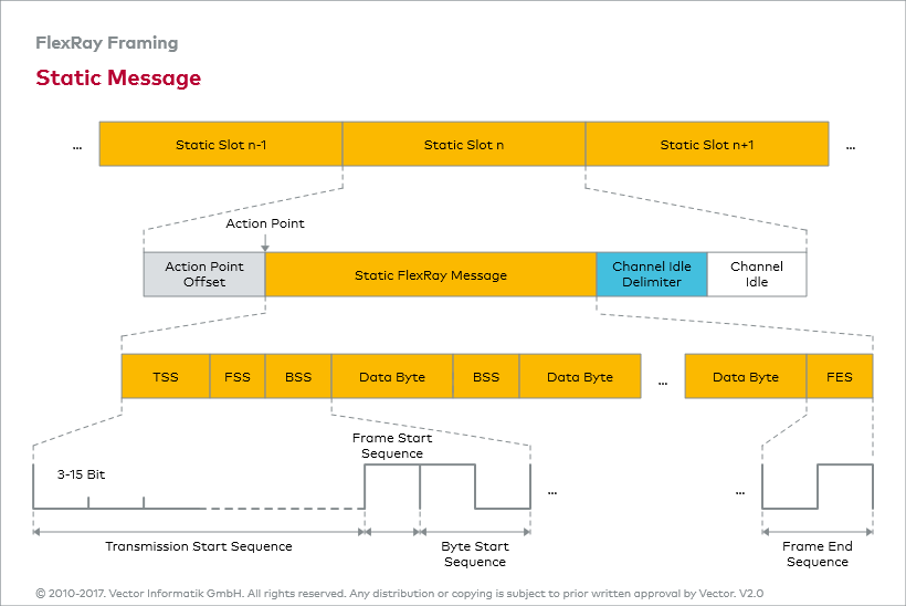 报文的物理传输不是从帧头的第一位开始,而是从传输起始序列(TSS)开始。FlexRay簇使用主动星型拓扑时,可以防止主动星型节点出现无法将报文的第一位从RX分支传输到TX分支的情况。