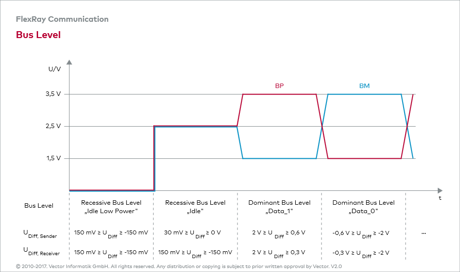 图“FlexRay Bus Level”显示了总线状态和总线电平,以及发送方和接收方的相关电压阈值。