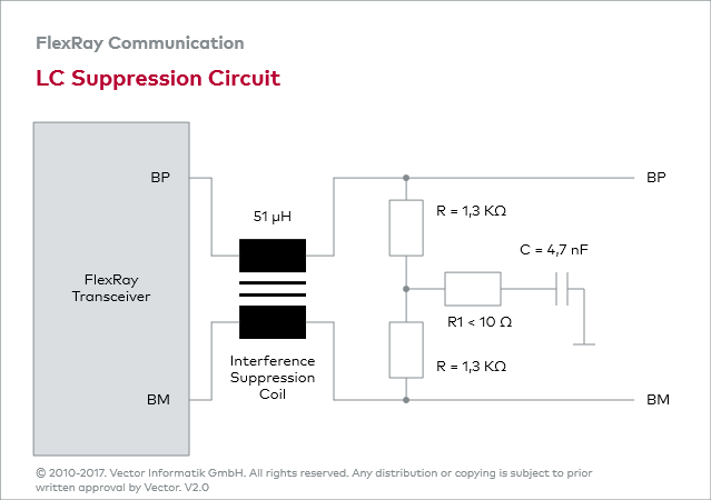LC电路有一个小缺点,即漏电感与耦合电容器组合会形成振荡电路,该振荡电路在FlexRay收发器的转换过程中会导致总线信号过冲。